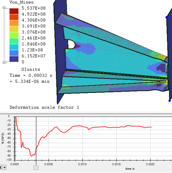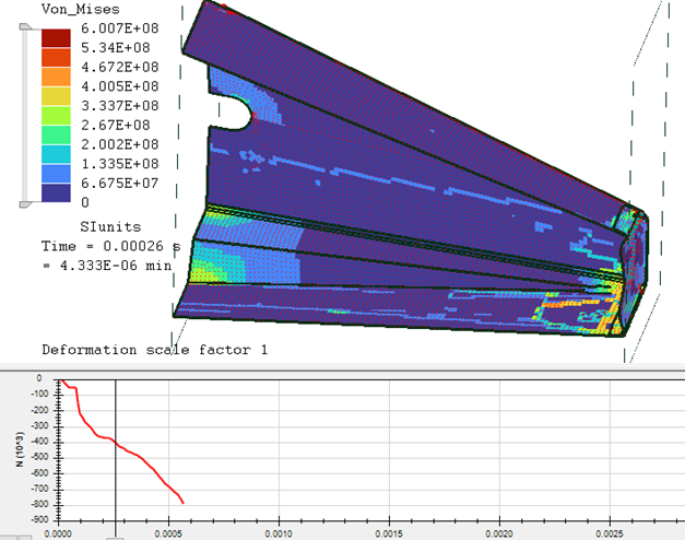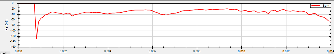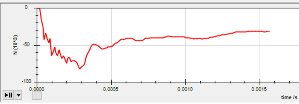 The half model had a peak of 82,5 kN at 0,00029s while the full model peaked earlier with 171 kN at 0,00014s. Since the full model is (within reasonable margin of error) twice as much as the half model, I think that it is reasonable to use the half-model for iterating the design faster. The full model takes 2-3 times as long to run as the half model and also takes longer to setup as there are more contact surfaces to click.