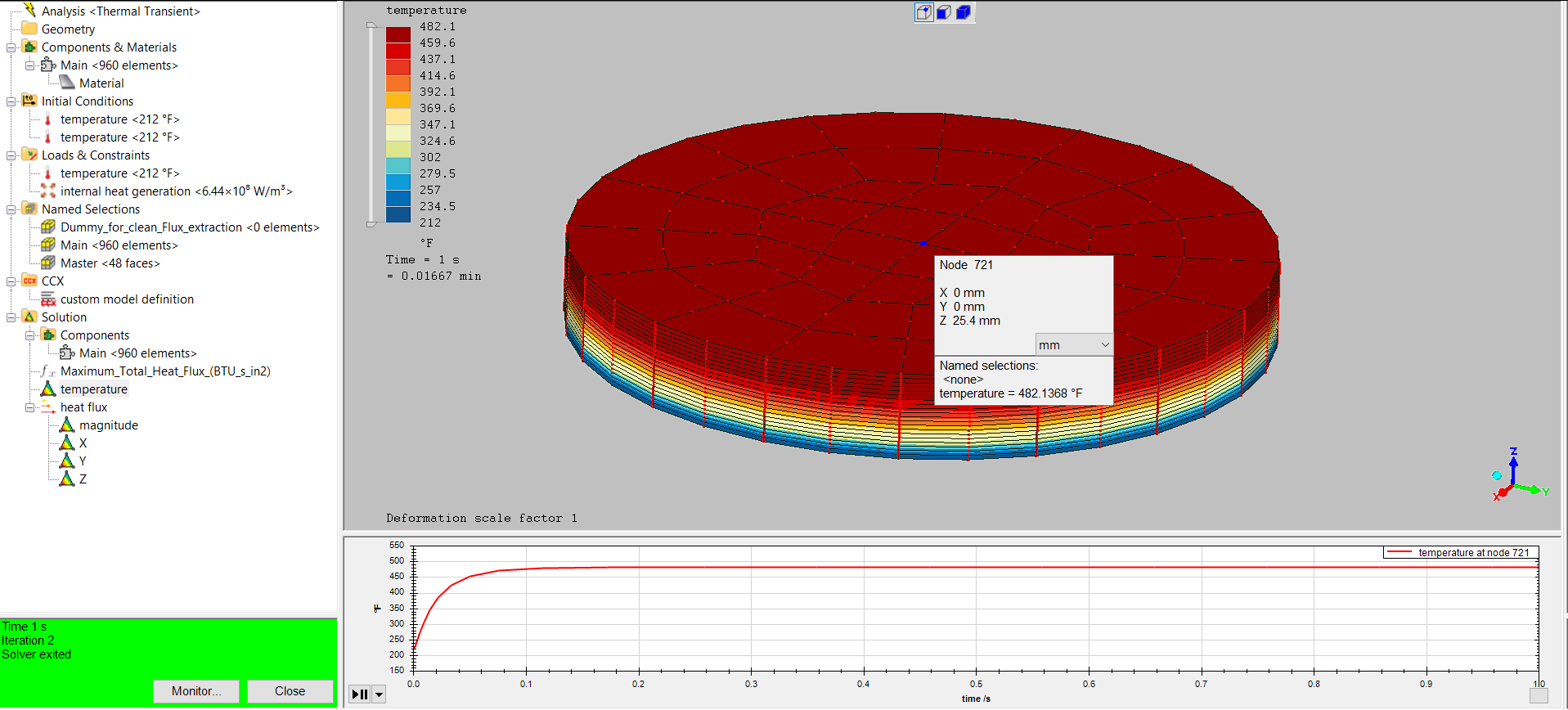 *MATERIAL,NAME=MATERIAL *DENSITY 1000 *CONDUCTIVITY,TYPE=ISO 555.1,0 563,4.3 662.4,58 761.9,111.8 861.3,165.6 960.8,219.4 1060.2,273.2 1159.7,326.9 1245.2,373.2 1259.1,380.7 1358.6,434.5 1458,488.3 1557.5,542 1656.9,595.8 1756.4,649.6 1855.8,703.4 1955.3,757.2 2054.7,810.9 *SPECIFIC HEAT 100,0 100,4.3 100,58 100,111.8 100,165.6 100,219.4 100,273.2 100,326.9 100,373.2 100,380.7 100,434.5 100,488.3 100,542 100,595.8 100,649.6 100,703.4 100,757.2 100,810.9 *SOLID SECTION,ELSET=MAIN,MATERIAL=MATERIAL *INITIAL CONDITIONS,TYPE=TEMPERATURE TEMPERATURE_NODES(2),373.15 TEMPERATURE_FACES(2),373.15 *PHYSICAL CONSTANTS,ABSOLUTE ZERO=0.,STEFAN BOLTZMANN=5.669E-8