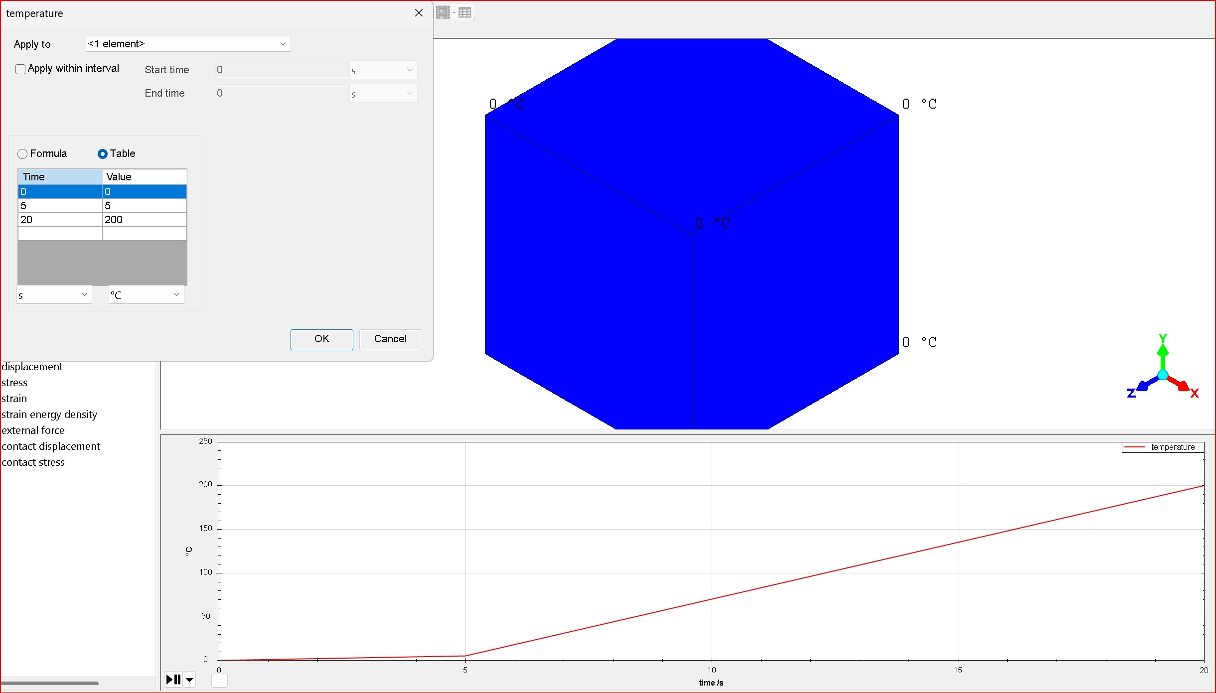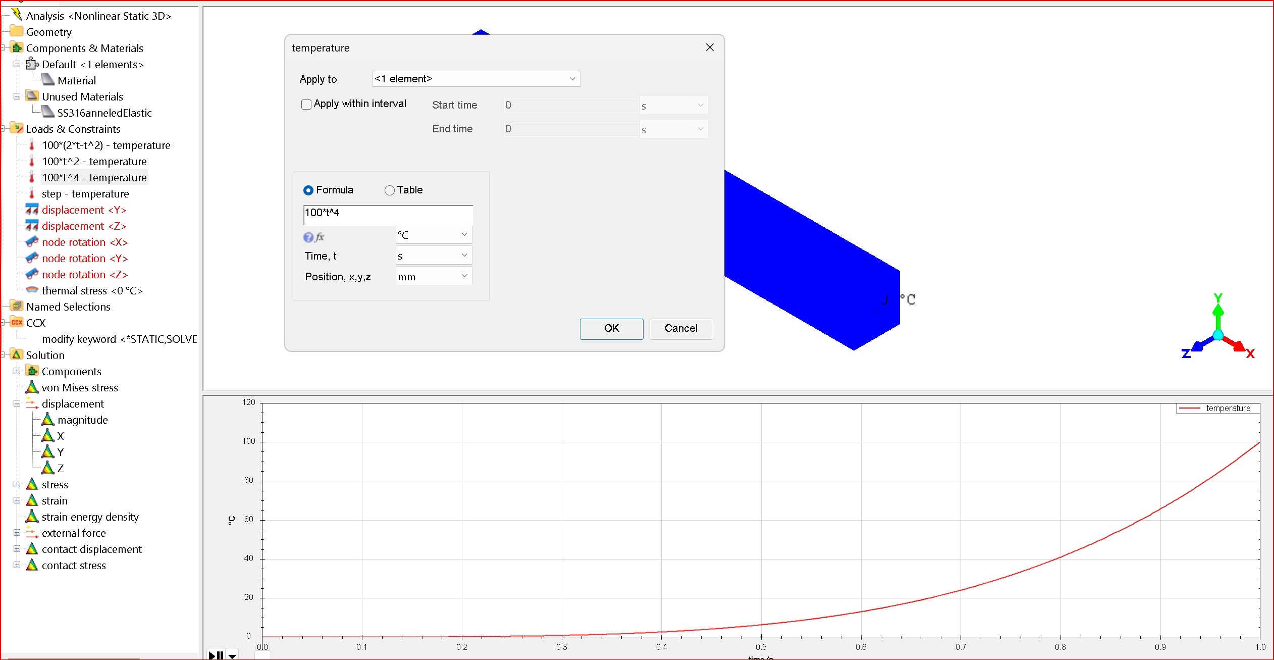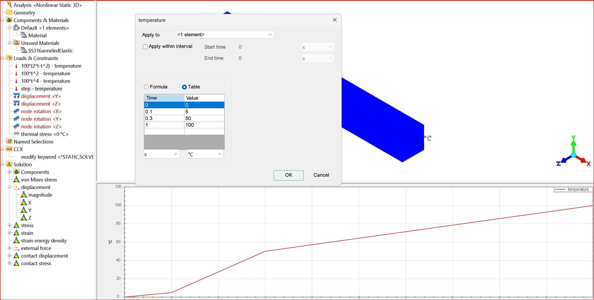 I want to start with vary small time steps as the transient analysis begins, as the temperature load of 150 DegC is applied to initial temperature of 20 DegC, with constant convection, giving a discontinuity at the start.