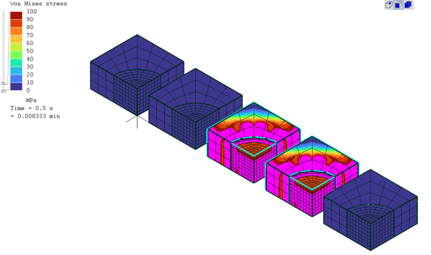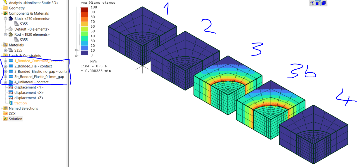 Contacts 3 and 3b (bonded, elastic) cause stress without any load on the model.