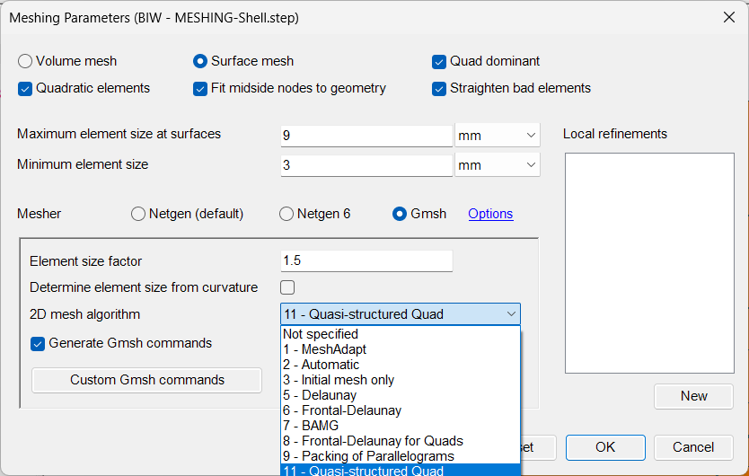 GmshSetting for Mesh.Algorithm (2D mesh algorithm). Default is now 2 (automatic) which often gives better element shapes than not specifying it.
