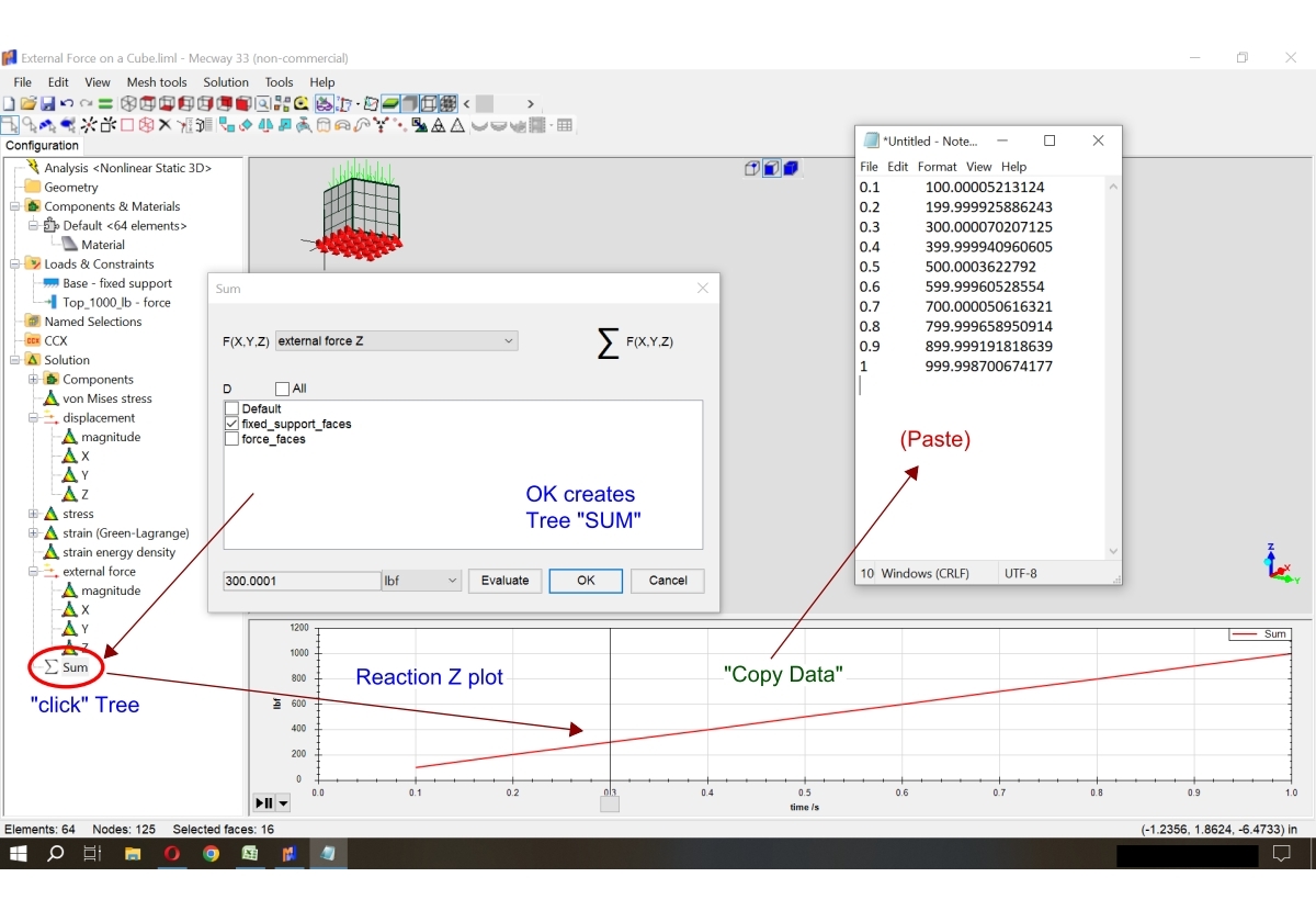 Hi! Doing a quasistatic analysis in Calculix nonlinear static 3d. For some reason I'm not getting the external force value to show up as a sum in the table. Even when I create a sum based upon the displacement face (or restraint face) It's not showing up as an option when building the table. I see every node in that face for each time, not the sum. I could've sworn once upon a time I did force/displacement curve instead of force/time in the graph at the bottom of the UI. Thanks for you help!