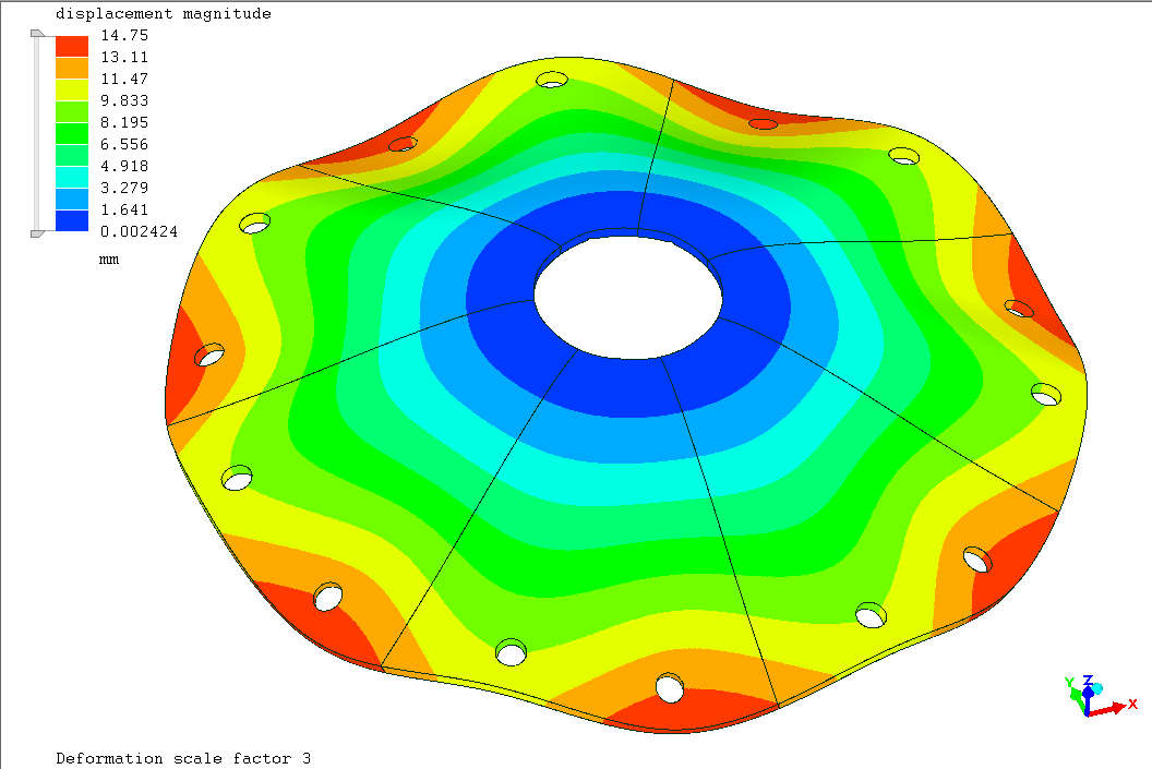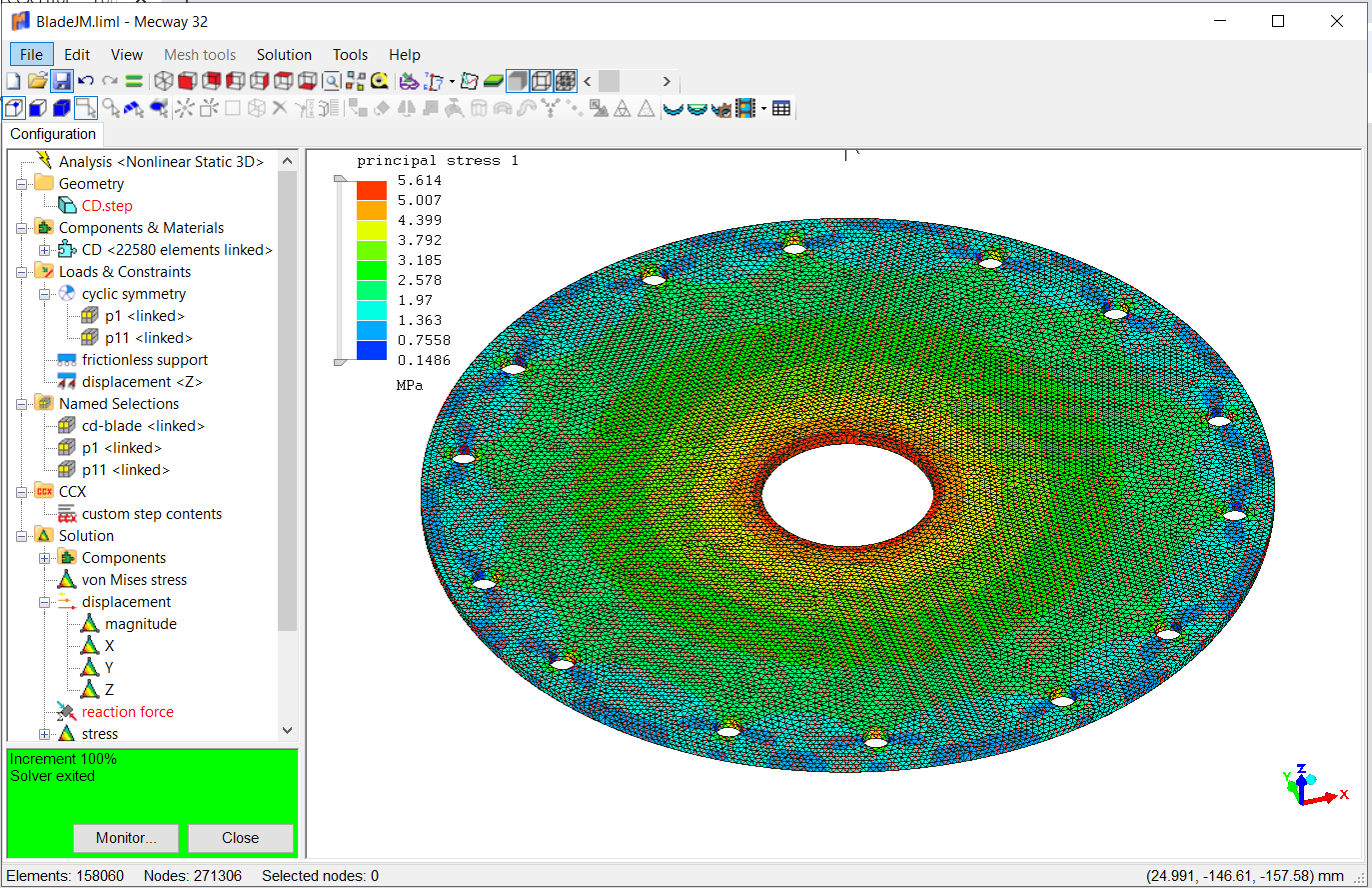 I haven't done this for a living for over 15 years so I might be a little rusty. I used the Mecway cyclic symmetry feature, put your DLOAD in the custom step contents and changed how you hold the hub. Strictly speaking your load is symmetric so you could simply run with symmetry at the cut boundaries, but I tested the model with an out-of-plane non-symmetric load (suppressed pressure) and results seemed okay as well.