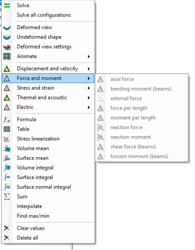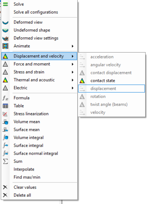 - Added displacement and reaction force to the solution using the same menus you showed in your last post. They are no longer disabled since analysis type has been set to Static 3D where they're valid.