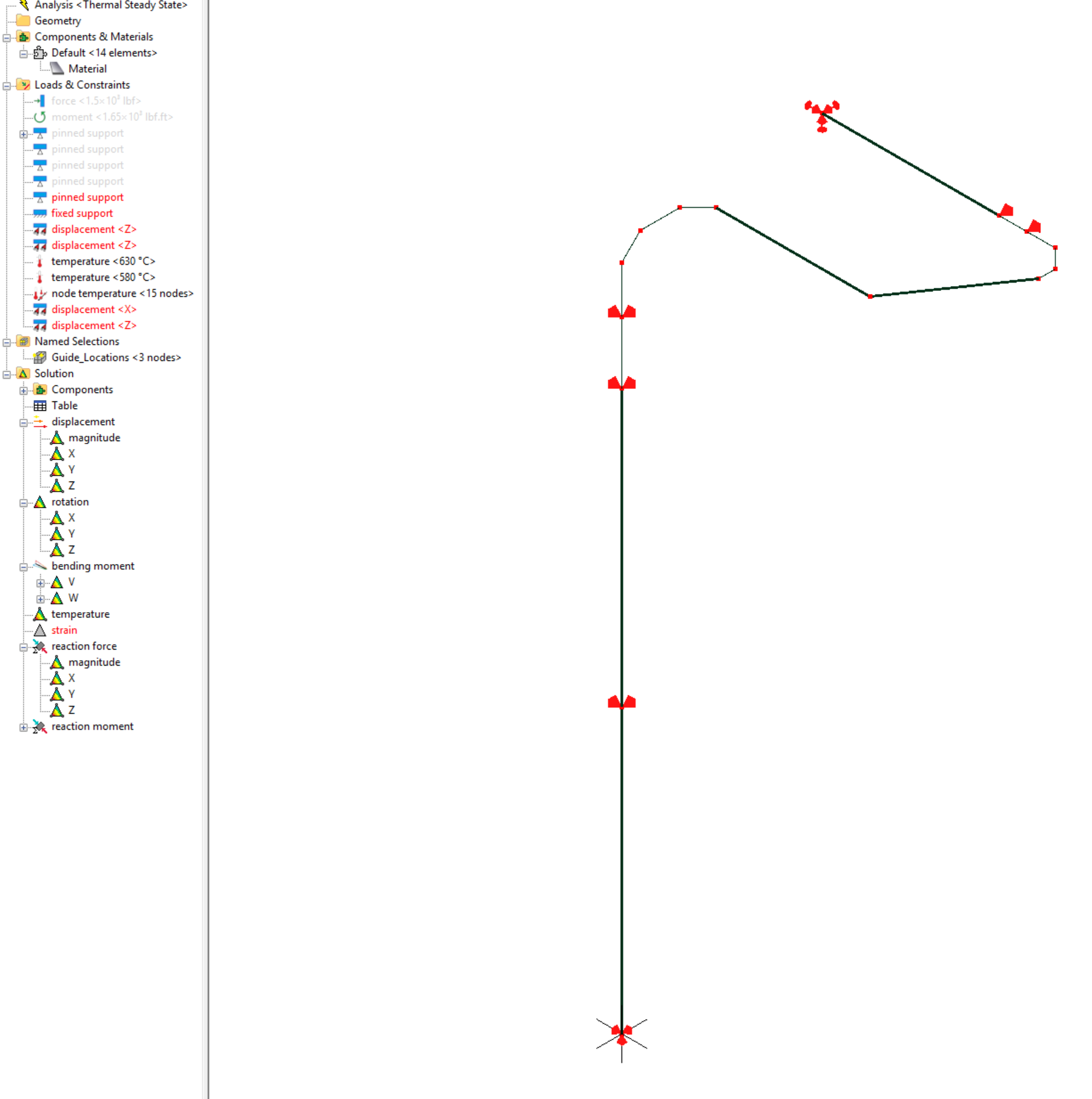 I am trying to use Mecway in place of a pipe stress program in order to find the reaction forces on some pipe supports. The temperatures modeled a the nodes "should" produce thermal displacements, but for some reason they don't. With solids and meshed models I have been able to get results before, but this seems to be a new challenge changing to line elements.