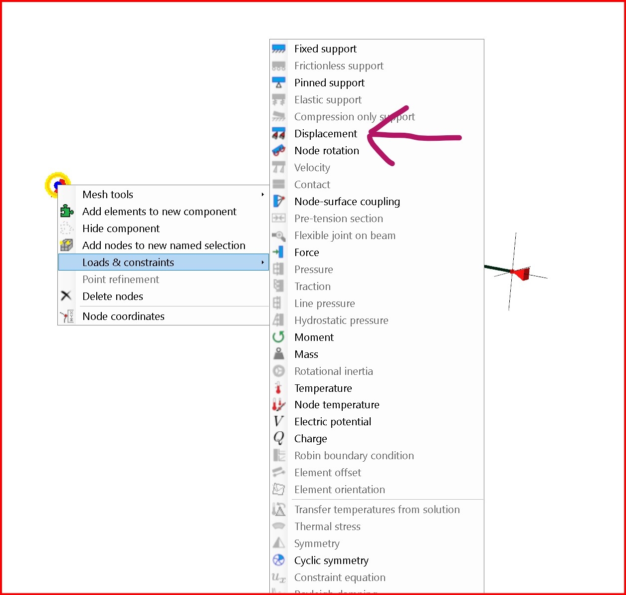 select node (or surface), right click on the point, select displacement, chose which axis you wish to restrain, and then enter zero at the bottom to fix it