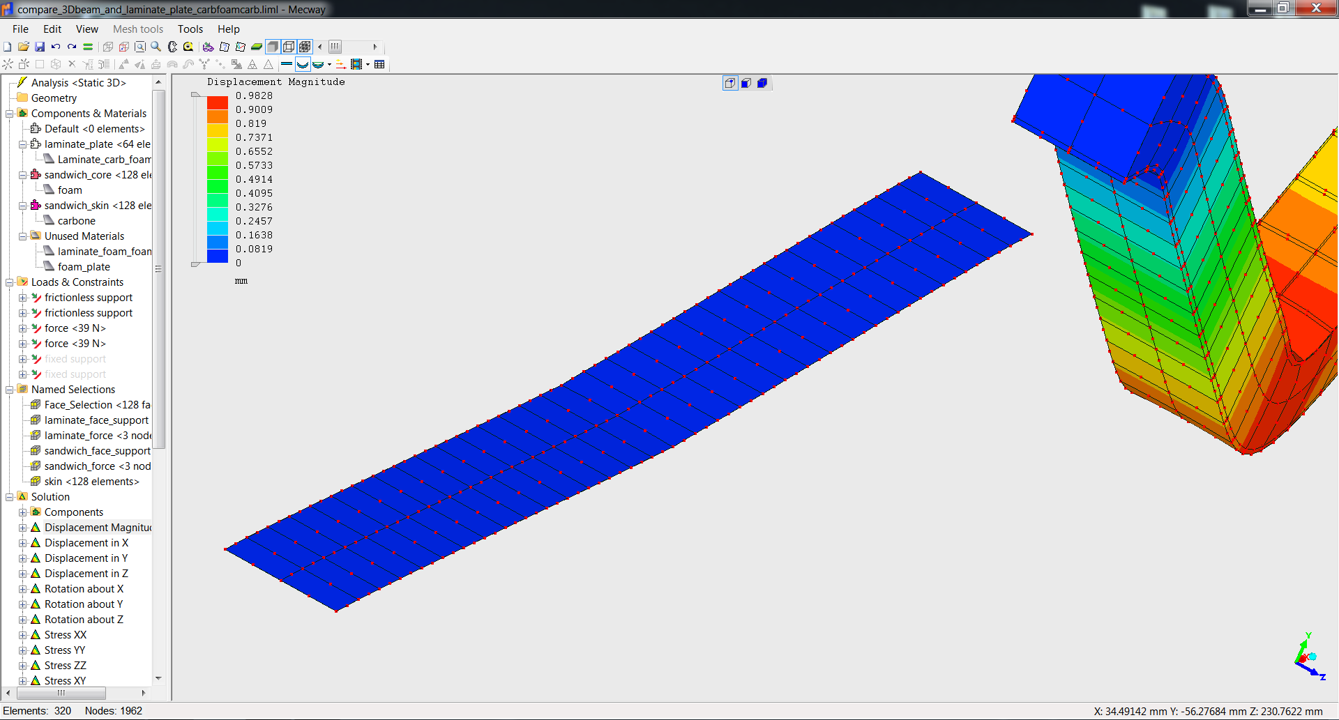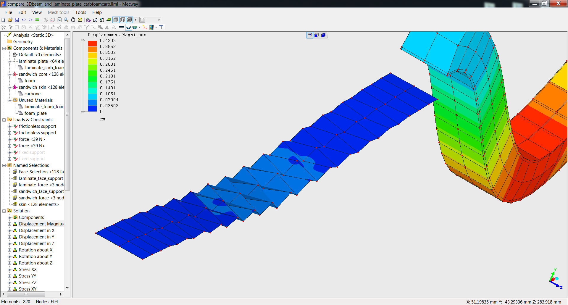 Curiously the hand formula for sandwich beam gave me a stiffer result (0.47mm bending) than 3D shape but softer result than laminate plate. So I don't know what is the best way to model this. Is the 1.2 mm skin too small in comparison of the core for 3D volume ?