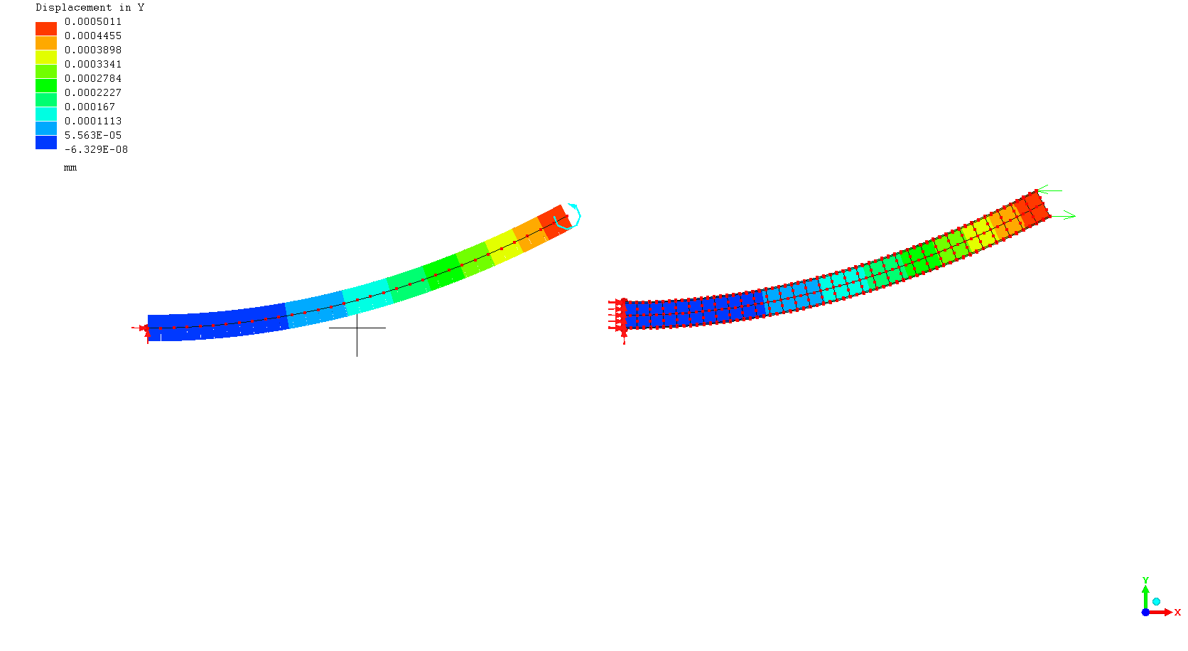 By the way, the zig-zag displacement of the shell is partly caused by what's really a zig-zag force distribution. To get a uniform force, you need to apply 19.5N to the middle node, and a total of 19.5N to the two edge nodes (9.75N each). I used a face load for this instead to avoid calculating that strange distribution.